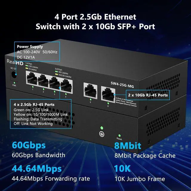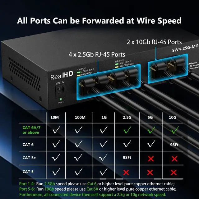 10G/2.5G Super-FastThis 10 gigabit switch features 2 x 10G RJ45 ports and 4 x 2.5G Base-T port, providing higher-speed connectivity for your devices and allowing you to easily upgrade your network to support the latest 2.5G ethernet standard. NOTE: To get 2.5GB high network speed please use CAT6 or higher level pure copper ethernet cable. Please make sure other network products come with 2.5GB network cards to get whole network 2.5GB speed, otherwise the network speed will be determined by the lowest speed network device.