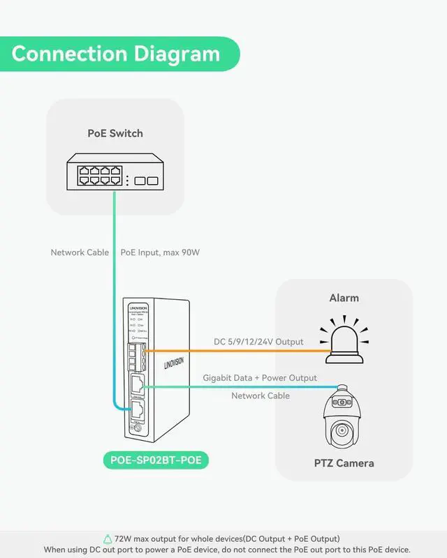 NOTED - POE-SP02BT-POE needs to work with standard IEEE802.3bt/at standard PoE switches, like POE-SW508G(ASIN: B09XDY8R9G) or POE-IN9001(ASIN: B0CYLHFZHT). Please do not connect it with non-standard BT POE Switches or Injectors, including POE-IN90W (Passive PoE version).
