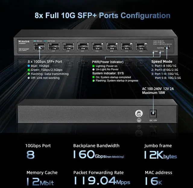 Model10G0800GSEthernet8* 10G SFP+ ports Chip SchemeRTL9303Bandwidth160GbpsPacket Forwarding Rat119.04MppsMac Address Table16KJumbo Frame12KbytesNetwork ProtocolIEEE802.3 (Ethernet) IEEE802.3u (Fast Ethernet) IEEE 802.3ab (Gigabit Ethernet) IEEE 802.3z (Gigabit Ethernet fiber standard) IEEE 802.3ae (10G Ethernet) IEEE802.3x (Flow control)Optical MediaMultimode Fiber: 50/125, 62.5/125, 100/140um Single mode Fiber: 8/125, 8.7/125, 9/125, 10/125umWorking environmentWorking temperature: - 10~50 ° C Storage temperature: - 40~70 ° C Working humidity: 10%~90%, non-condensing Storage humidity: 5%~95%, non-condensingindicationIndicator Light PWR (Power Indicator) PWRPower IndicatorOn: Powered on, Off: Powered off, SYS, Flashing: System startup in progress On: System startup completed, SFP Port Light Blue on: 10G link, Green on: 1000M/2500M link, Flashing: Data transmitting, Off: Link not workingDialing lightLeft Side: 1 to 8 Ports have speeds of 10G/1G. Middle: 1 to 8 Ports have speeds of 10G/2.5G. Right Side: 1 to 4 Ports have speeds of 10G/1G, 5 to 8 Ports have speeds of 10G/2.5G.Structure sizeProduct size: 232*126*28mm Package size: 350*210*55mm Net weight: 0.83KG Gross weight: 1.11KGSupply voltagePower Adapter: 12V2APowerMaximum 18WPacking listSwitch 1PCS, manual 1PCS, power cord 1PCS 10G Lightning-Fast Connections 4-Speed(10G/5G/2.5G/1G) Plug and Play & Unmanaged Open SFP Slot Fanless & Silent Operation Wall Mountable LED Indicator Lighting Protection Product Specifications