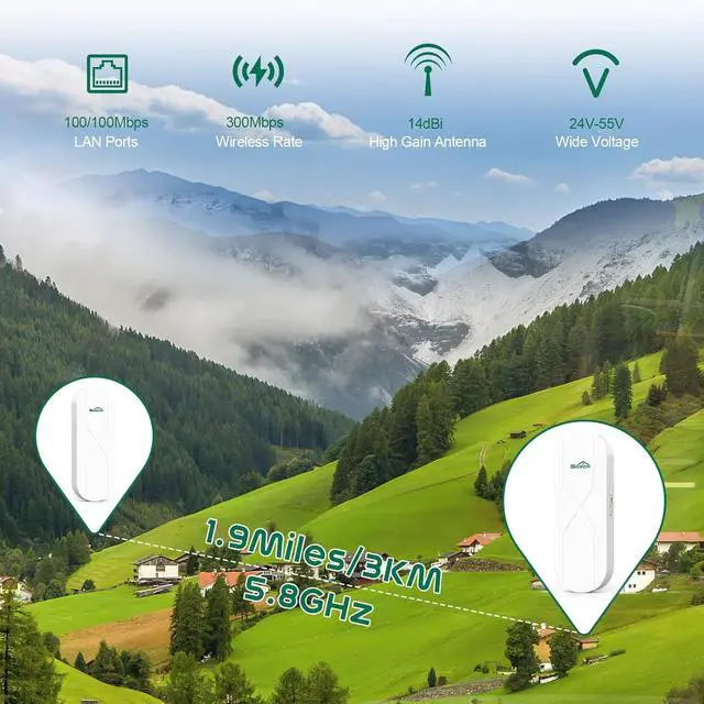 5.8GHz Wireless TechnologyThe point to point wireless bridge operates on the 5.8GHz frequency band, with strong anti-interference ability, good stability, high scalability and flexibility, and can meet 8 non-overlapping channel deployments. The wireless transmission rate of this wifi bridge can reach 300Mbps, which can easily and stably perform data transmission or network expansion.