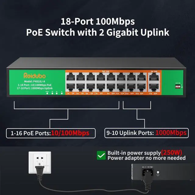 18-Port PoE SwitchThis PoE network switch features 16 PoE ports (10/100Mbps) and 2 gigabit uplink ports for high-speed connections. Gigabit uplink ports provide higher bandwidth (1000Mbps) compared to standard 100Mbps ports. Special Attention: The maximum transmission speed of the 16 PoE ports is 100mbps, not 1000mbps.