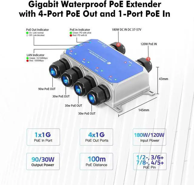 5 Gigabit PoE Ports: Include 1 PoE In, 4 PoE Out, 10/100/1000Mbps speed. 100BASE-TX, Cat5 or later UTP(150 meter); 1000BASE-TX: Cat6 or later UTP(100 meter)