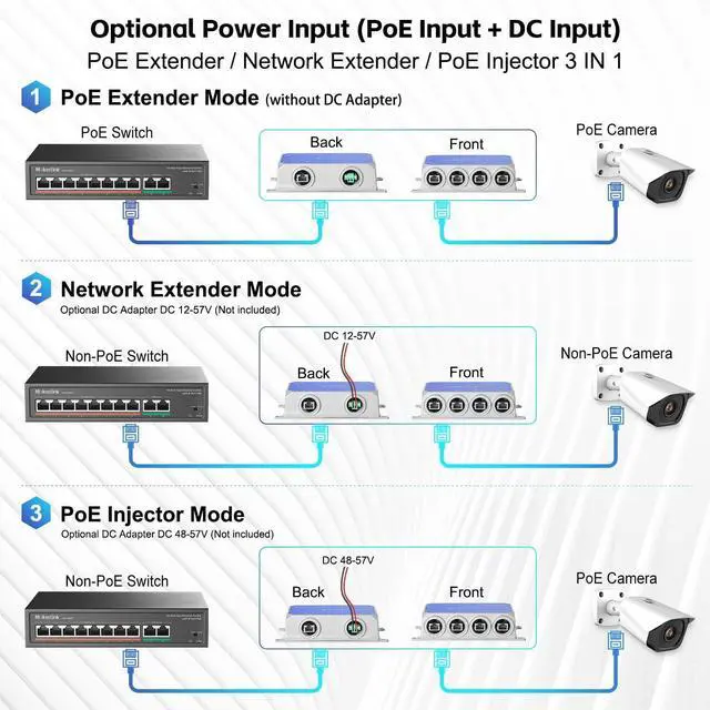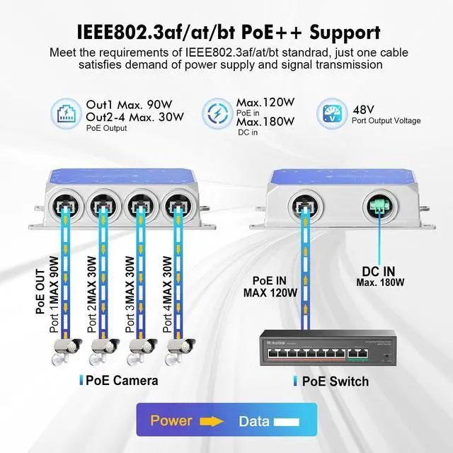 Easy Installation: No need for additional power adapter, powered by POE network. It also supports DC44-57V Max180W power input and provides a Phoenix terminal power connector. Meta case, support wall mount, small size, save space, suitable for more positions. Support 3-level cascading, can connect poe AP, camera, phone and other POE devices, increase POE coverage at low cost