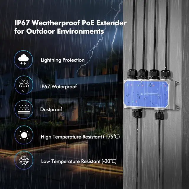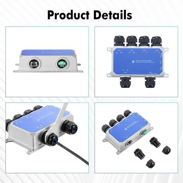 IP67 Outdoor Weatherproof: Rugged industrial grade metal housing, cable interface are all protected in the shell, with waterproof cap, which has better waterproof, dustproof and snowproof effect, and is more suitable for outdoor and indoor environments, such as warehouses, computer rooms, garages, attics, etc. **Pass the network cable through the waterproof cap and then make RJ45 connection**