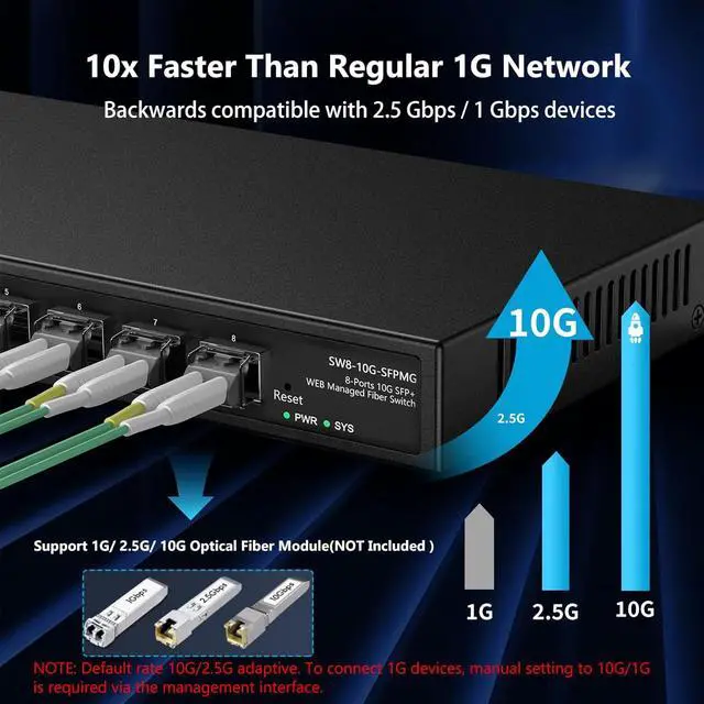 10Gb Super-Fast Fiber SwitchThis 10 gigabit switch features 8 x 10G SFP+ ports and 160Gbps switching capacity, providing higher-speed connectivity for your devices and allowing you to easily upgrade your network to support the latest 10Gb standard. Default port rate: 10G/2.5G adaptive. To connect 1G devices, manual setting to 10G/1G is required via the management interface. Only Compatible with TP-Link 10Gb SFP+ Transceiver and Real HD 10Gb SFP+ to RJ45 Transceiver. Throught the 10GB SFP+ to RJ-45 Module support the CAT6a or above copper cable for the fast rate(The Module is NOT Included).