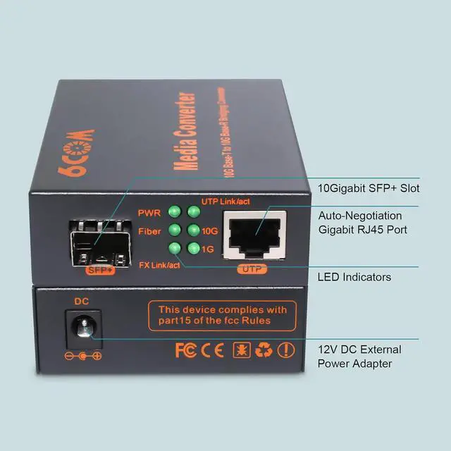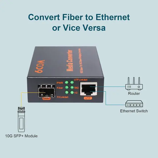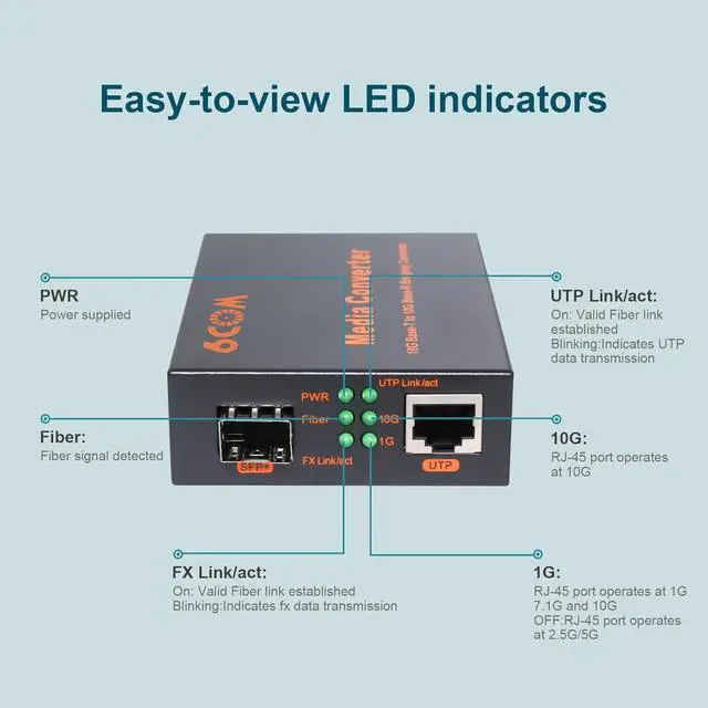 Easy-to-view LED Indicators'PWR' light when the power is up; 'Fiber' light when fiber link is established; 'Link/act' light when RJ45 link is established and flash when transmit data; '1G' light when RJ45 port connect to 1G devices; '5G/2.5G' light when RJ45 port connect to 2.5G or 10G devices; '10G' light when RJ45 port connect to 10G devices.