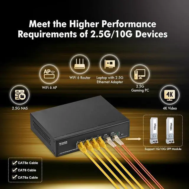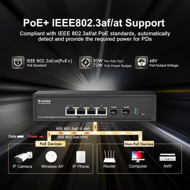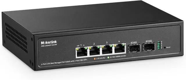 2.5G Ports: The network switch has 4 x 2.5Gigabit Ethernet Ports, compliant IEEE802.3bz (2.5G) standard, support 10/100/1000M/2.5G adaptive. 2 x 10G SFP Port(compatible 1G/2.5G Module, not include SFP Module). 60Gbps backplane bandwidth, excellent data forwarding performance