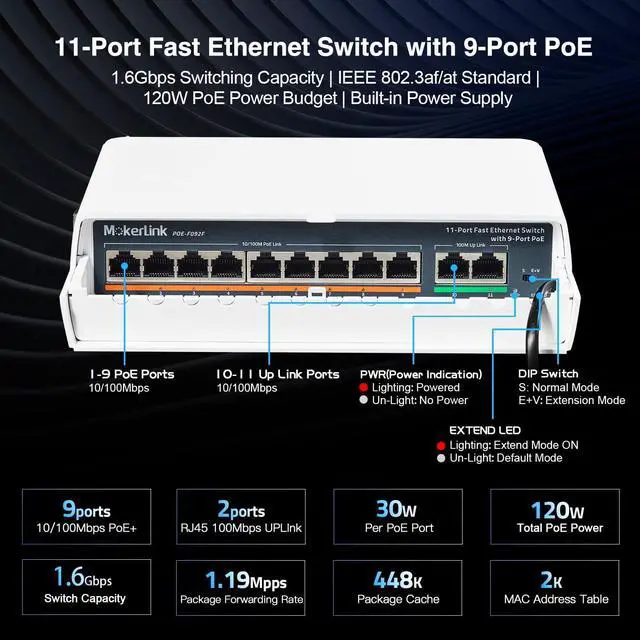 ModelPOE-F092FOEthernet9 x 10/100Mbps PoE Ports + 2 x 10/100Mbps Uplink Ports Bandwidth2.2Gbps Pack forward rate1.19Mpps MAC address2k Network ProtocolIEEE802.3 (10Base-T), IEEE802.3u (100Base-TX), IEEE802.3x (Flow control)PoE ProtocolIEEE802.3af(15.4W), IEEE802.3at(30W) Network Medium10Base-T : Cat3, 4, 5 or above UTP(100m), 100Base-TX : Cat5 or above UTP(100mWorking EnvironmentWorking Temperature: -10~50°C, , Storage Temperature: -40~70° C Working Humidity: 10%~90%, non-condensing, Storage Temperature: 5%~90%, non-condensing IndicatorPWR (Power), 1-11 Green Light (Link&Data), PWR On: Powered on, Off: Powered off.CasingABS plastic Structure SizeProduct Dimensions: 200*118*44mm, Package Dimensions: 230*190*70mm, Product N.W: 0.7kg, Product G.W: 0.95kg Power VoltageInput voltage :AC100-240V, Power supply: 52V / 2.3A (120W) Packing ListSwitch 1 PC, Power cord 1 PC, User manual 1 PC Smart PoE IP66 Waterproof Port Isolation Long Distance PoE Plug and Play Easy installation Fanless & Silent Operation Wide Operating Temperature Product Specifications