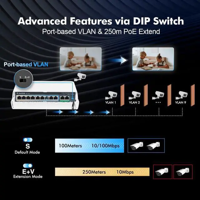 By dialing extend switch to enable long-range transmission, the transmission distance of a PoE port can be up to 250m (bandwidth reduced to 10 Mbps).