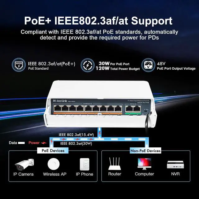 The PoE port meets the IEEE 802.3af/at standard,It determines and delivers the exact power supply to your devices.