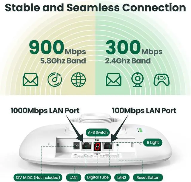 WiFi 5 High Speed: This point-to-point wireless bridge features a 4x15dBi high-gain antenna, supporting 2.4G/5.8G dual-band for Gigabit speeds; Ideal for faster file uploads/downloads, HD video streaming, video conferencing, and online gaming