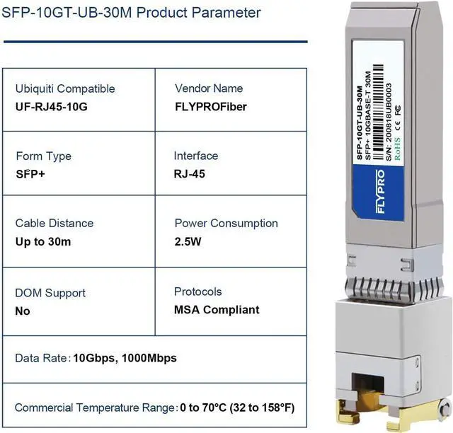Wide-Compatibility - The 10GBase-T SFP+ to RJ45 Transceiver fully compatible with Ubiquiti UF-RJ45-10G, and used in fiber switches, routers, NIC, media converters, servers and other fiber equipment with 10Gb SFP+ transceiver ports.