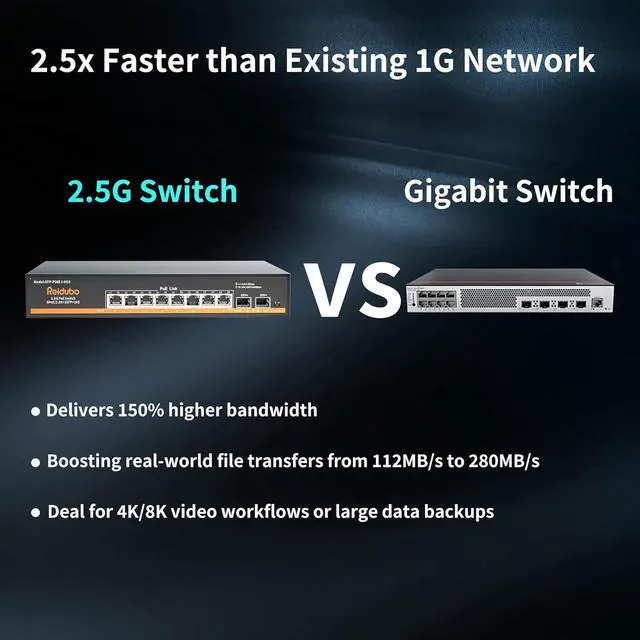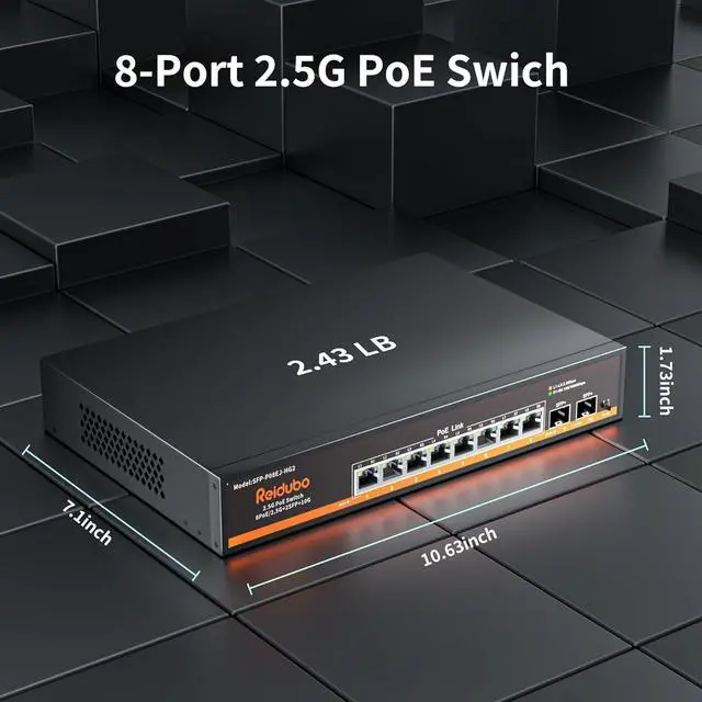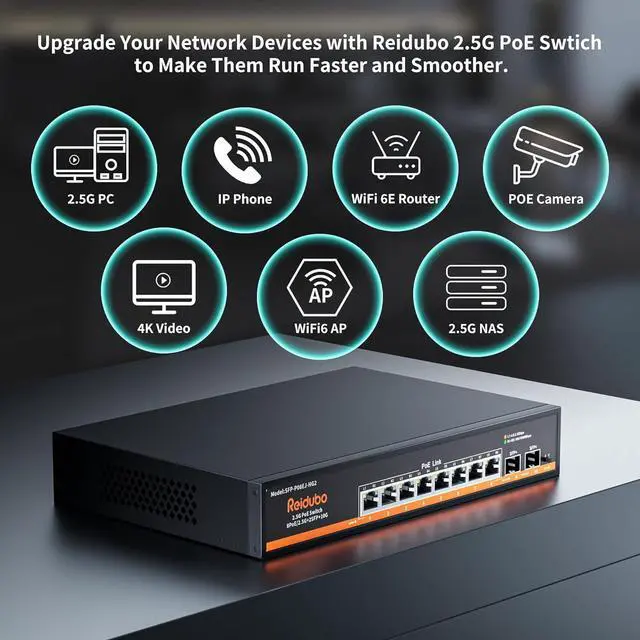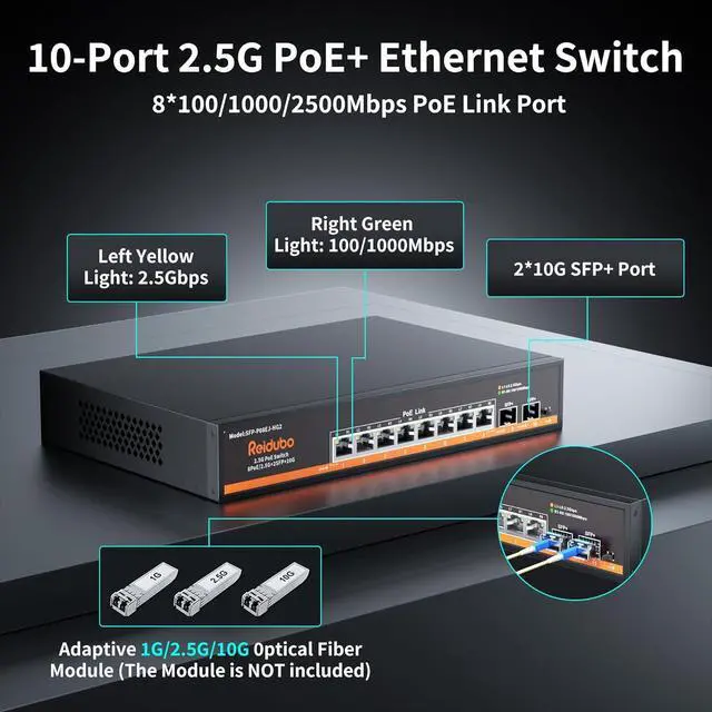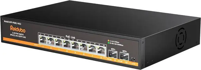 2.5G High-Performance PoE Switch10-port design with 8×2.5G PoE ports + 2×10G SFP+ uplinks. Supports 10/100/1000M/2.5G auto-negotiation, ideal for 2.5G NAS, WiFi 6 APs, 4K PoE cameras, and more. 10G SFP modules (not included) enable high-speed connections to routers, NVRs, or servers