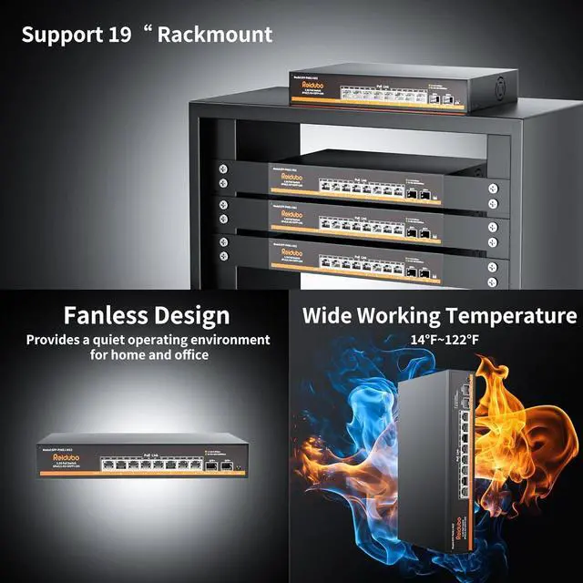 Flexible Installation Desktop, wall mounting or rack-mountable, include mounting kits. LED indicators show power status, port activity, and connection speeds for easy troubleshooting