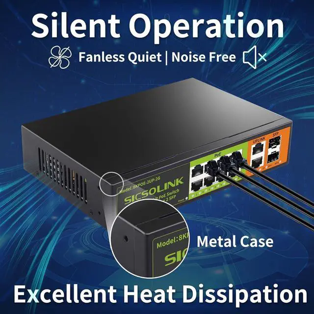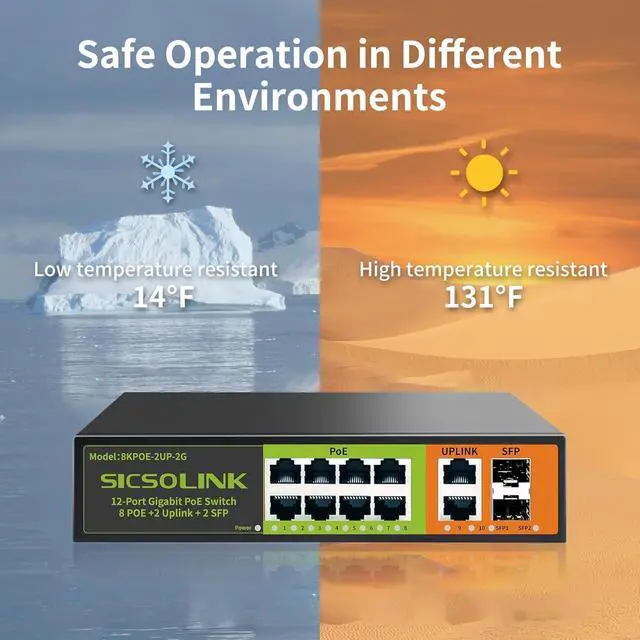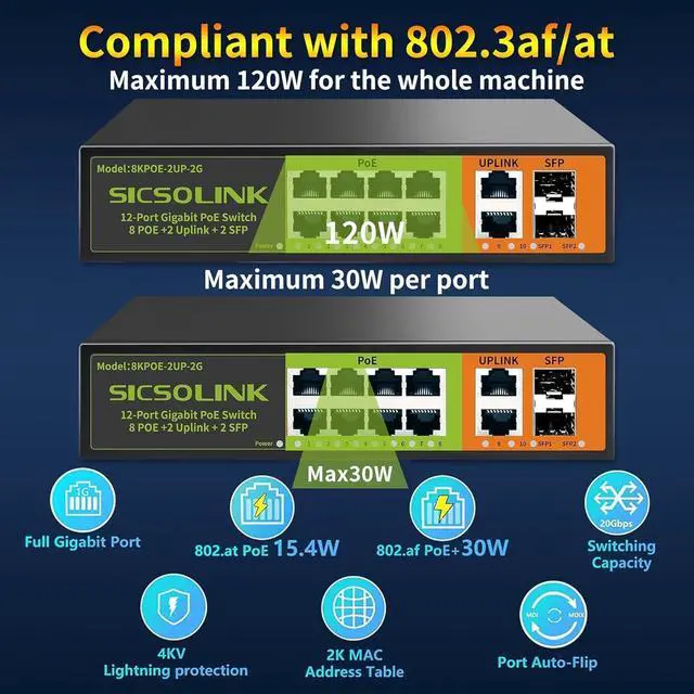 Model8KPOE-2UP-2GEthernet8 Port 1000Mbps POE + 2 Port 1000Mbps Ethernet+2 Port 1000Mbps SFPSwitching Capacity20Gbps (full duplex mode) MAC Address2KPOE PortsPort 1-8 Signal Pinout1 2 3 6Power Pin1/2+; 3/6-Network ProtocolIEEE 802.310B ase-T IEEE 802.3 u(100Base-TX) IEEE 802.3 ab(1000Base-TX) IEEE 802.3 x (Flow control) POE ProtocolIEEE 802.3AF 15.4 wIEEE 802.3AT (30w)