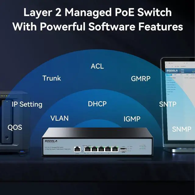 Advanced L2 Management FeaturesEffortlessly Layer 2 managed switch, device status, and configurations via the intuitive web interface, and a suite of configurations LACP,VLAN,SNMP, HTTP,DHCP,Multicast,MAC,RSTP and More.((Note: Please set IP address via IPV4 first before log in this switch).