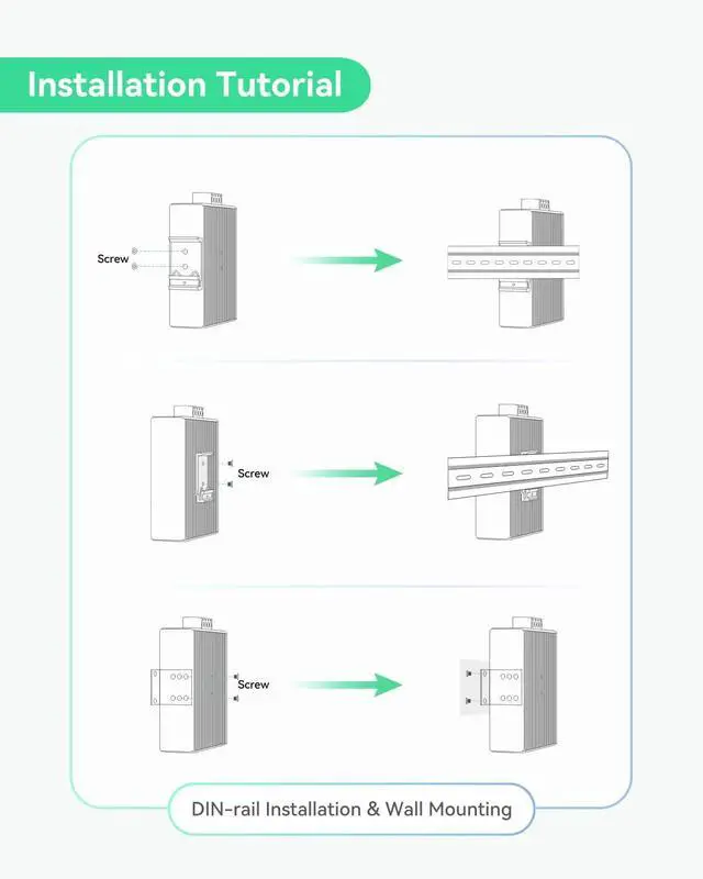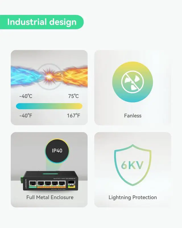 Industrial Design - Compact IP40 rugged metal enclosure; Wide working temperature -40 to 167 (-40°C to 75°C); Support DIN-Rail & Wall Mount.