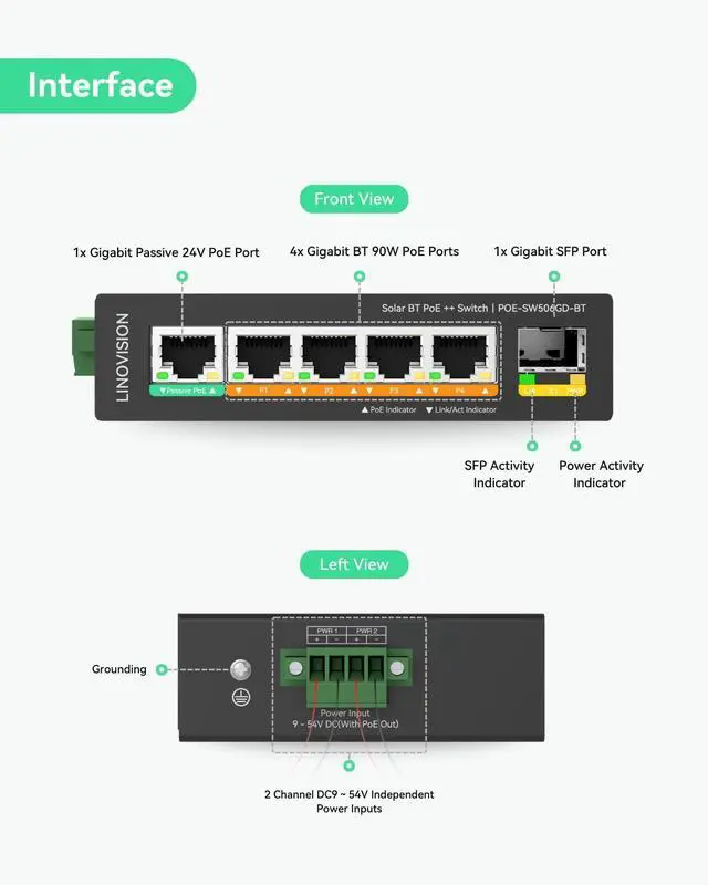 5 Ports Full Gigabit PoE Switch - with 4 BT90W PoE++ ports and 1 passive PoE port, compliant with IEEE802.3af/at/bt standards. Total PoE Budget: 240W (DC48V input) or 180W (DC24V input) or 90W (DC12V input)