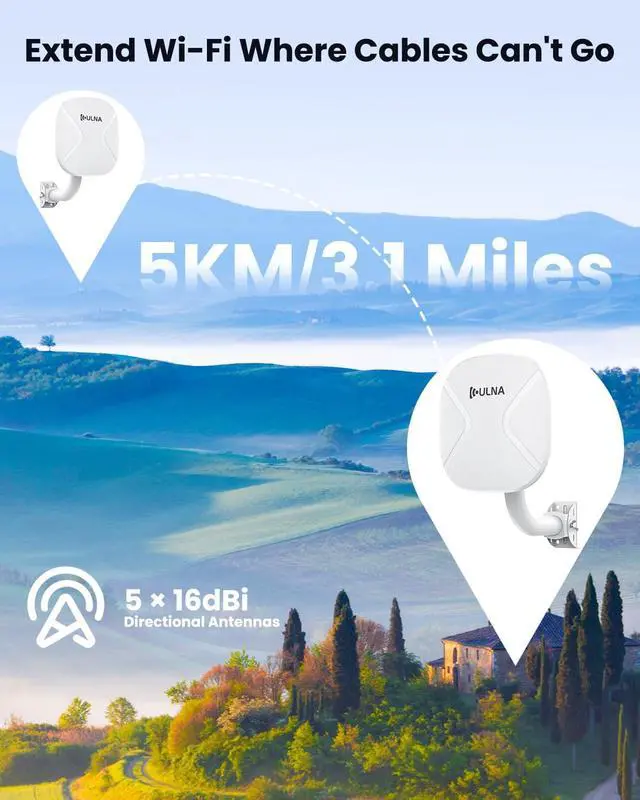 5KM STABLE WIRELESS TRANSMISSION: Built with 5x 16dBi directional antennas, this long range wireless bridge enables up to 5KM point-to-point connectivity. Ideal for expanding networks across buildings, ranch, or large outdoor properties with reliable signal strength