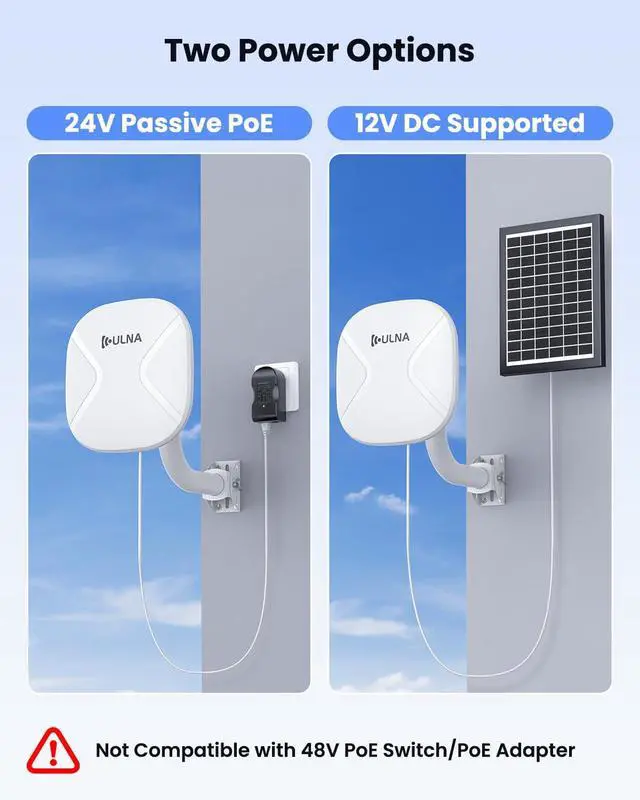 TWO POWER OPTIONS: ULNA CPE806S wifi bridge point to point outdoor supports 24V passive POE and 12V/1A DC solar panel input for flexible power setup in outdoor environments. A perfect choice for off-grid farms, construction sites, or mobile deployments. Note: Not compatible with 48V POE switches or 48V adapters