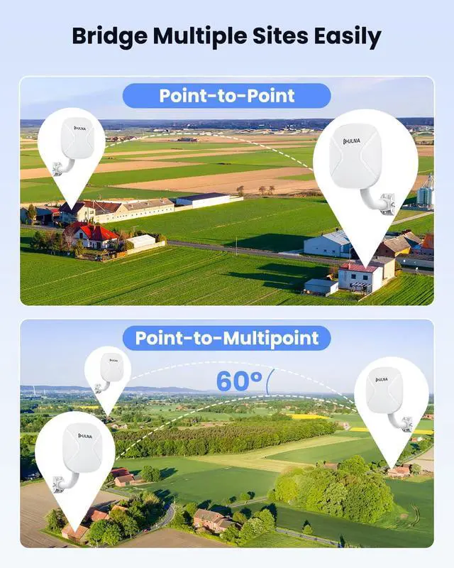 POINT-TO-POINT & POINT-TO-MULTIPOINT READY: Designed for network expansion across buildings or IP camera backhaul, this wireless internet bridge supports both point-to-point and point-to-multipoint transmission modes, ideal for security systems, warehouses, cabins, or campuses