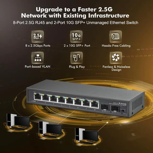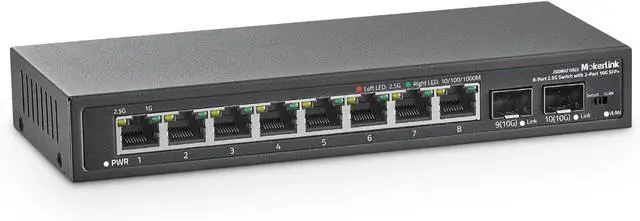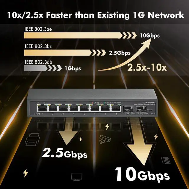 2.5G Ports: The network switch has 8 x 2.5Gigabit Ethernet Ports, compliant IEEE802.3bz (2.5G) standard, support 10/100/1000M/2.5G adaptive. 2 x 10G SFP Port(compatible 1G/2.5G Module, not include SFP Module). 80Gbps backplane bandwidth, excellent data forwarding performance