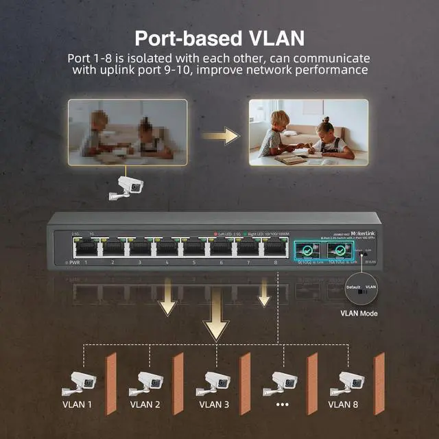 Metal Fanless: With durable metal casing, fanless design lowers energy consumption, quiet no noise and stable operation; Support one key VLAN Isolation, Ports 1-8 are isolated from each other and only communicate with uplink ports 9-10, reducing network storms and improving security