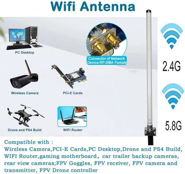 Frequency : the wifi antenna work on both 2.4GHz and 5.8GHz wifi system ,support 802.11a/b/g and 802.11a .