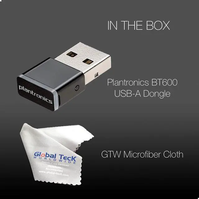 Includes 2Piece Bundle Global Teck kit with certified Poly BT600 USB-A Bluetooth Adapter + premium microfiber cleaning cloth for Poly headsets and device care