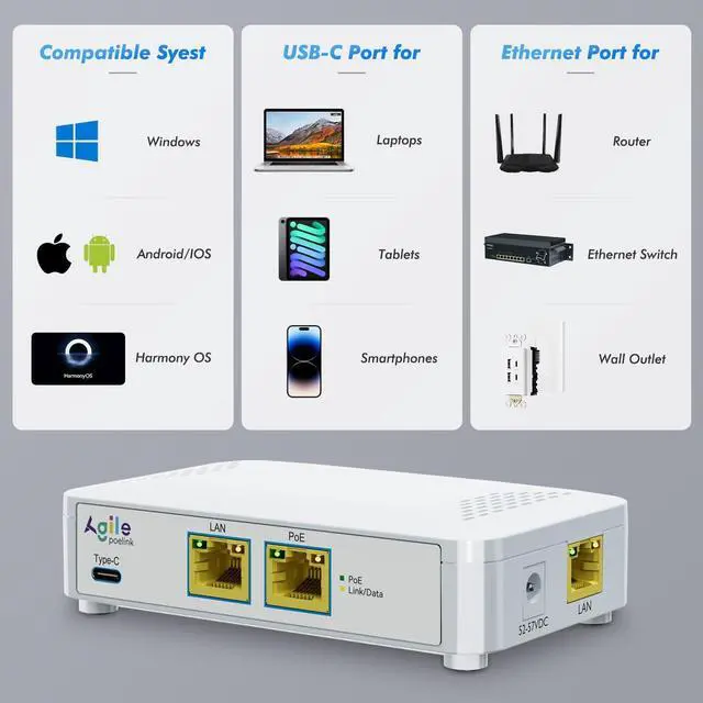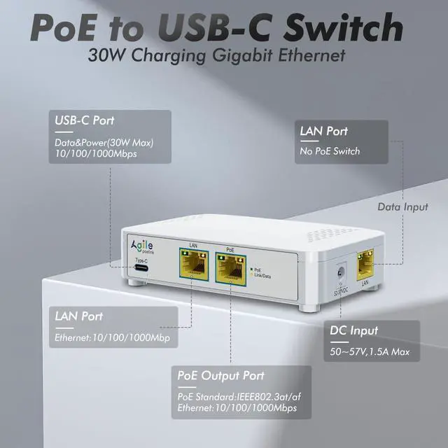 PoE to USB C Switch 60W IEEE 802.3at/af compliant PoE switche, Total Power Budget 60W, Plug and Play and simplifies deployment.