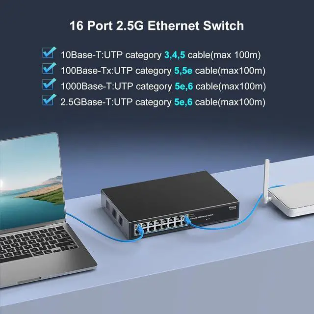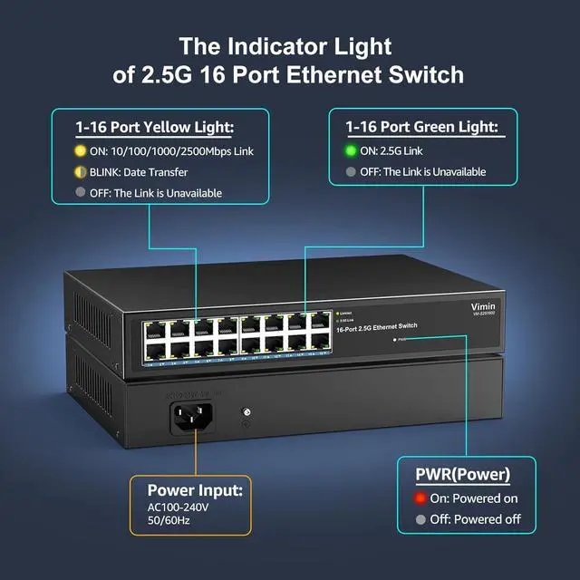 2.5Gbps Network Switch: VIMIN 16 Port 2.5G unmanaged network switch offers 16x 2.5Gbase-T ports , providing fast and reliable network connectivity with a 120Gbps ethernet switching capacity. Ports 1-16 comply with the IEEE802.3bz (2.5G) standard, support 10/100/1000M/2.5G adaptive.