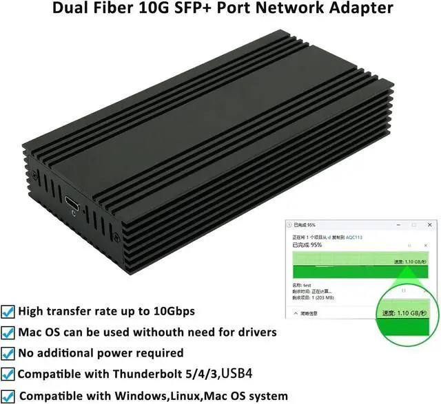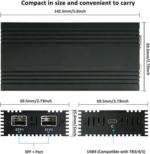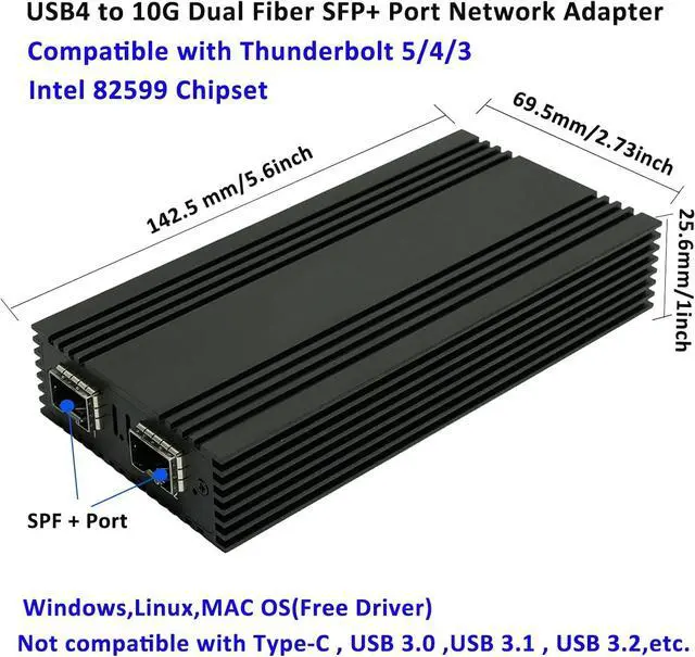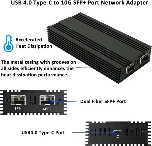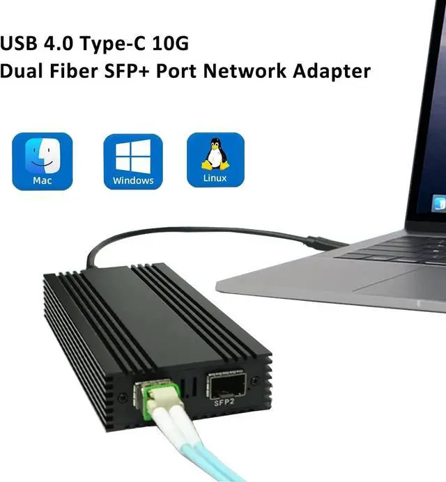 Double Optical Port Design: our 10 Gigabit Ethernet adapter with dual ports and could connect your different computers with USB4 Type-C port, or as of a USB device daisy chain. Dual 10Gb SFP+ fiber port ethernet adapter is perfect for IT engineers, video editors, and data center technicians for fiber networks