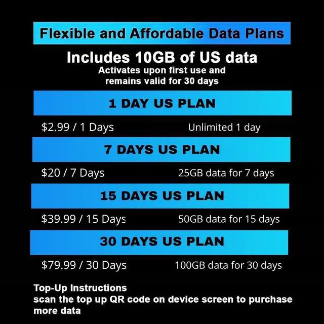 FLEXIBLE DATA PLANS WITH NO COMMITMENTS: The most popular option includes 100GB of US data valid for 30 days. You can also select from budget-friendly plans like Unlimited for 1 day $2.99, 25GB for 7 days $20, 50GB for 15 days $39.99, and 100GB for 30 days $79.99. Additional plans are available for international travelers.