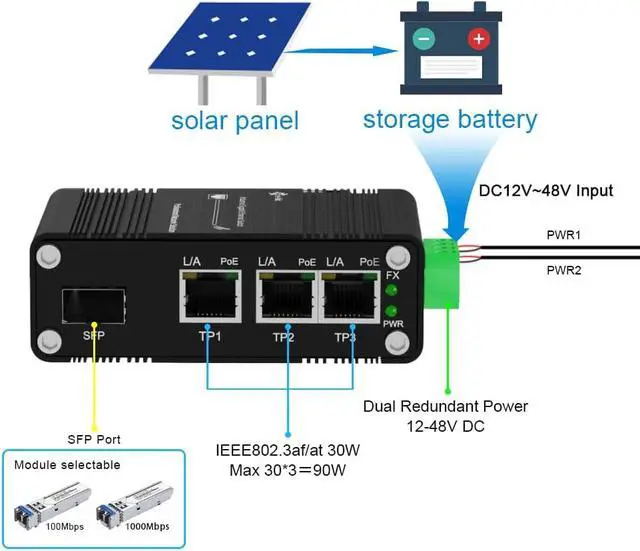 Compliant with IEEE802.3af/atSolar Fiber PoE Switch input, - support IEEE802.3af/at Standard, 30W/port max power can reach 90W PoE output.