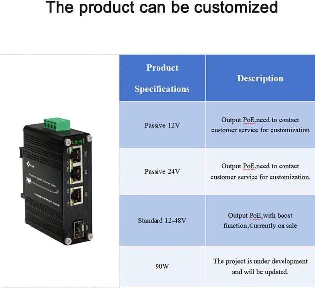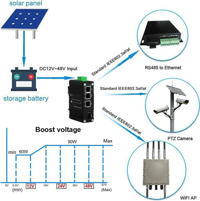 Boost VoltageSupport 12V/60w 24V/90w 48V/90w,the 4 ports PoE switch can be used for Solar Power/VoIP/RV Truck.