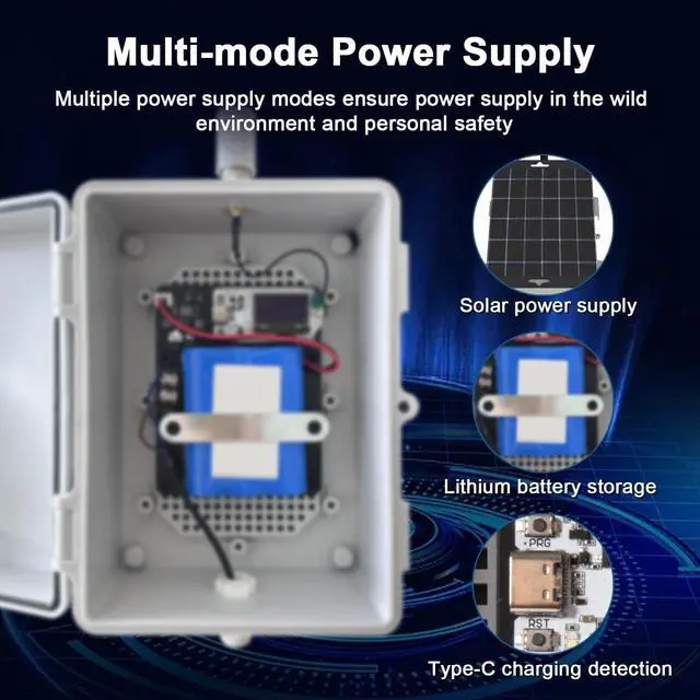 Multiple Power Supply options: This meshtastic repeater equipped with a 6000mAh rechargeable battery and solar panel, also supports Type-C charging, ensuring continuous power supply for extended outdoor use.