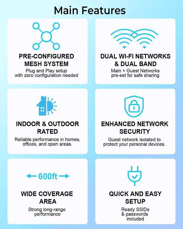 Convenient Setup: Enjoy a stress-free setup with provided Wi-Fi credentials, allowing you to connect effortlessly to the network and experience the benefits of a robust and reliable Wi-Fi mesh system.