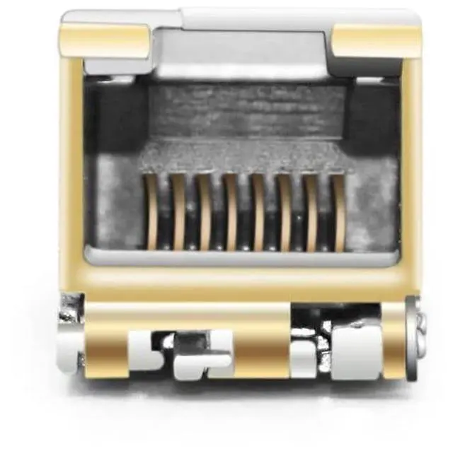 RJ45 interface with hot swappable, Plug and Play, designed for 10G Ethernet connections within racks and across adjacent racks over Cat 6a/7 cable.