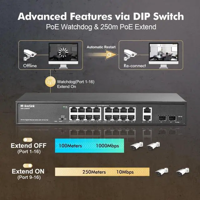 Extend Mode: When turn on, the 9-16 POE port can be extended to 250 meter distances and 10Mbps speed; Simultaneously enable the POE wachdog function to automatically monitor POE devices. the port will be restarted when drops, increasing reliability
