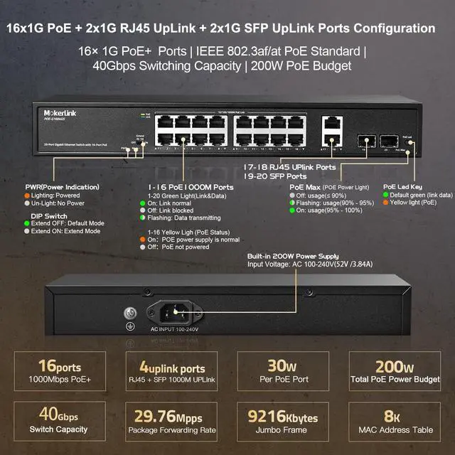 20 Gigabit Ports: Includes 16 Gigabit POE+ ports, 2 Gigabit UpLink, 2 Gigabit SFP. The ethernet ports support 10/100/1000Mbps automatic adaptation. The 2 gigabit uplink can be connected to different networks or devices, such as routers, NVRs, etc. The 2 Gigabit SFP Port can be connected to single-mode or multimode SFP modules, and transmit more distance through optical fiber