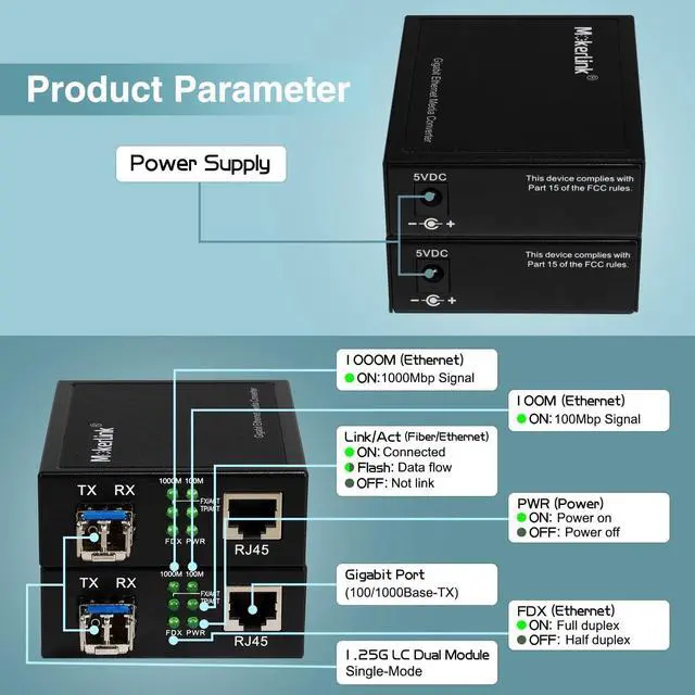 Plug and Play: connect the power supply, connect to the peer device through the optical fiber and the network cable, then can use it without configuration. **Please pay attention to the use of single-mode fiber with LC interface 1310nm, and TX/RX cross connection**