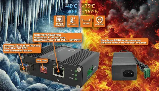High Performance 10G PoE++ Media Converter: Supports 100Mbps/1G/2.5G/5G/10G BASE-T RJ45 interfaces and 10GBASE-X SFP+ fiber optic interface, ensuring seamless and fast data transmission in industrial environments.