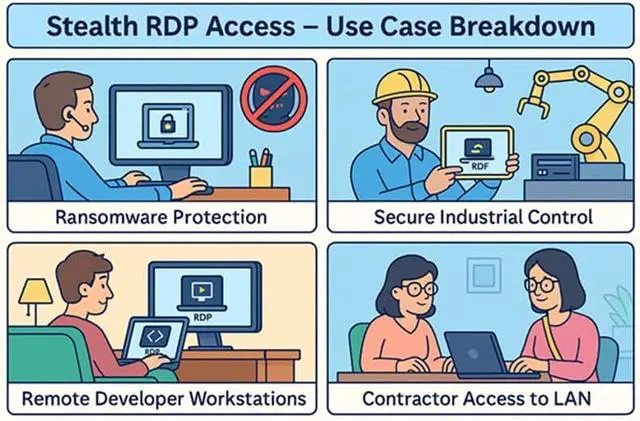 Stealth RDP Remote Access: Allows users to establish VPN connections to a private LAN and utilize LAN-mode RDP apps without requiring user registration, ensuring that no intermediary RDP cloud servers can track or record the activities.