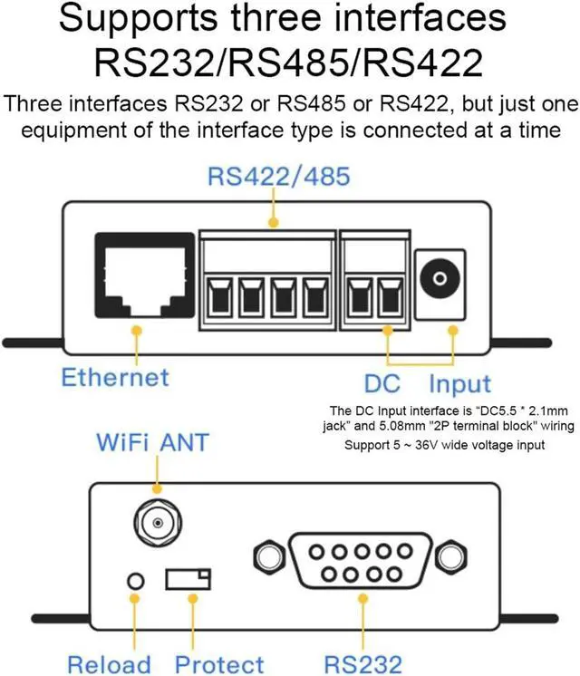 Serial Interface Parameters: Number Of Serial Ports: 1 (RS232 / 485/422).Interface Standard: RS232: DB9 pin type.RS485 / RS422: 5.08mm terminal block.Baud Rate: 600-230400bps.Data Bits: 8.Stop Bits: 1, 2.Parity: None, Even, Odd, Space, Mark.