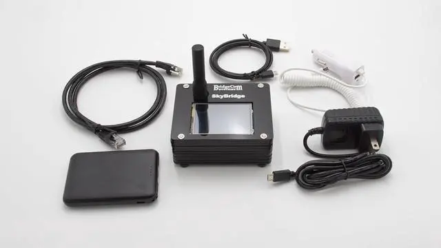 Included in the box: Wall plug adapter, portable external battery pack, USB cable, Ethernet cable, car power adapter, antenna, and QuickStart guide with the online training