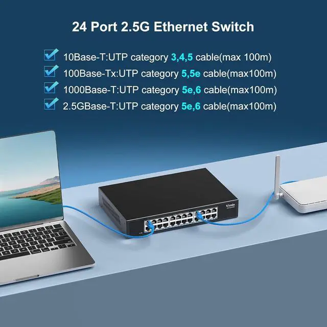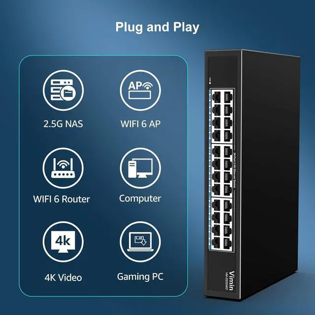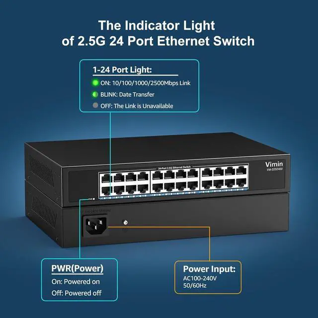 2.5Gbps Network Switch: VIMIN 24 Port 2.5G unmanaged network switch offers 24x 2.5Gbase-T ports , providing fast and reliable network connectivity with a 120Gbps ethernet switching capacity. Ports 1-24 comply with the IEEE802.3bz (2.5G) standard, support 10/100/1000M/2.5G adaptive.