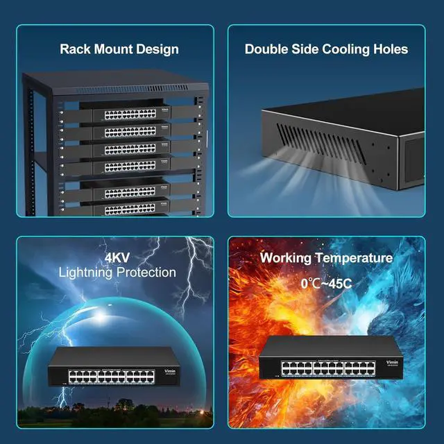 Durable and Silent Design: The VIMIN 24 port 2.5G switch features a sturdy metal housing that offers excellent durability and heat dissipation. 4KV lightning protection design. With a fanless design, it operates silently, making it suitable for noise-sensitive environments.