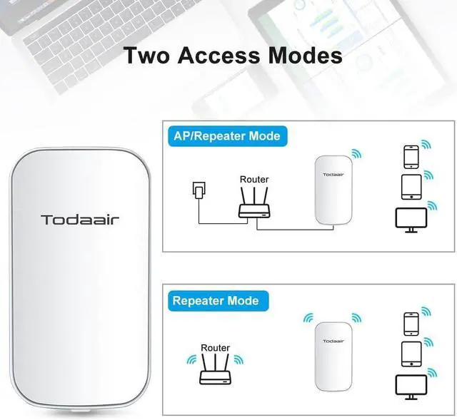 Supports 2 Working ModesTODAAIR Wi-Fi Extender has 1 Ethernet Ports with Repeater/AP, can easily turn your wired Internet connection into a wireless access point. It can also function as a wireless adapter to connect any Ethernet enabled wired devices, like Blu-ray player, game console, desktop or smart TV. Which can easily meet different needs.