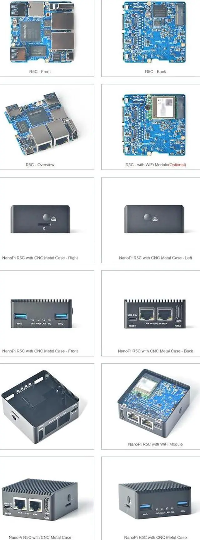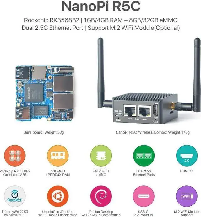 FeatureNanoPi R5C board equipped with a Rockchip RK3568B2 quad-core Cortex-A55 processor, and providing two 2.5Gbps Ethernet ports, 1 x HDMI 2.0.