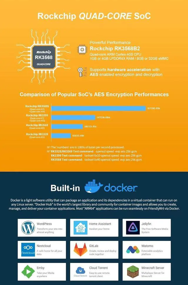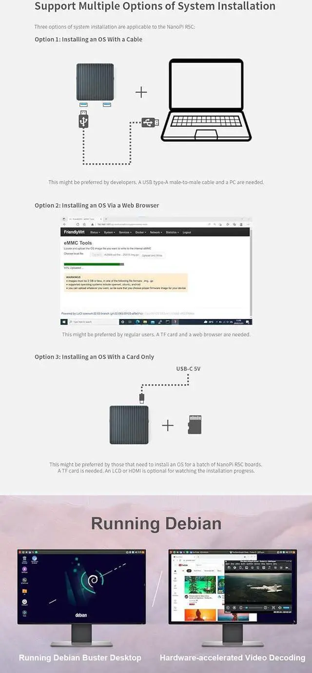 Open Source & ProgrammableNanopi R5C supports Android 12, Debain10, FriendlyWrt . FriendlyWrt is based on an OpenWrt distribution and works with Docker CE .Open source and well suitable for developing IoT applications, NAS applications, smart home gateways